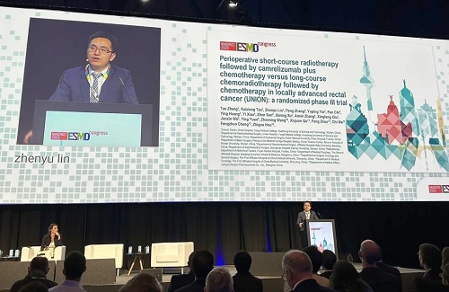 10月21日,AG百家乐医药创新药卡瑞利珠单抗(艾瑞卡®)的一项研究“新辅助短程放疗序贯卡瑞利珠单抗联合化疗对比长程放化疗序贯化疗治疗局部晚期直肠癌”随机对照Ⅲ期试验(UNION) 以优选口头报告的形式正式亮相。该研究由华中科技大学同济医学院附属协和医院张涛教授、陶凯雄教授担任主要研究者,华中科技大学同济医学院附属协和医院林振宇教授在马德里现场报告了该重磅研究的结果1,此项研究是全球首个评估短程放疗序贯免疫治疗联合化疗治疗局部晚期直肠癌的Ⅲ期研究,已达到主要终点病理完全缓解(pCR),有望为直肠癌患者的治疗提供新策略。